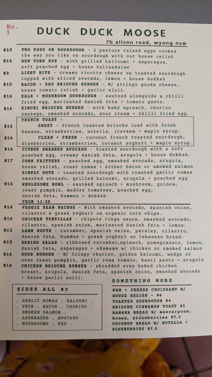 Duck Duck Moose also offers a tempting Daily Brunch selection, ideal for breakfast or a light meal. The Toasted Sourdough (2) with P.B/Honey/Vegemite/Jam provides a simple, comforting start to the day. For a heartier option, you can try the 2 Eggs on Sourdough, or the flavorful Citrus Smashed Avocado French Toast, a twist on the traditional French toast that combines savory and sweet. For a special treat, the Simply Dote is a fantastic indulgence, perfect for a leisurely brunch.